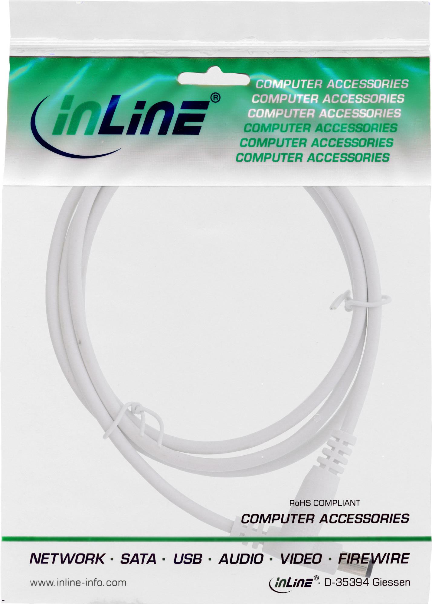 InLine® DC Stecker Verlängerungskabel, weiß• Innenleiter: Kupfer AWG 18• DC Stecker/Buchse: 5,5x2,1mm• max. 12V/11,6A (140W)