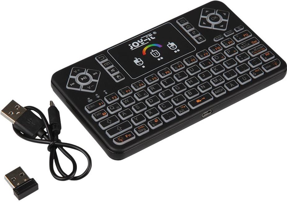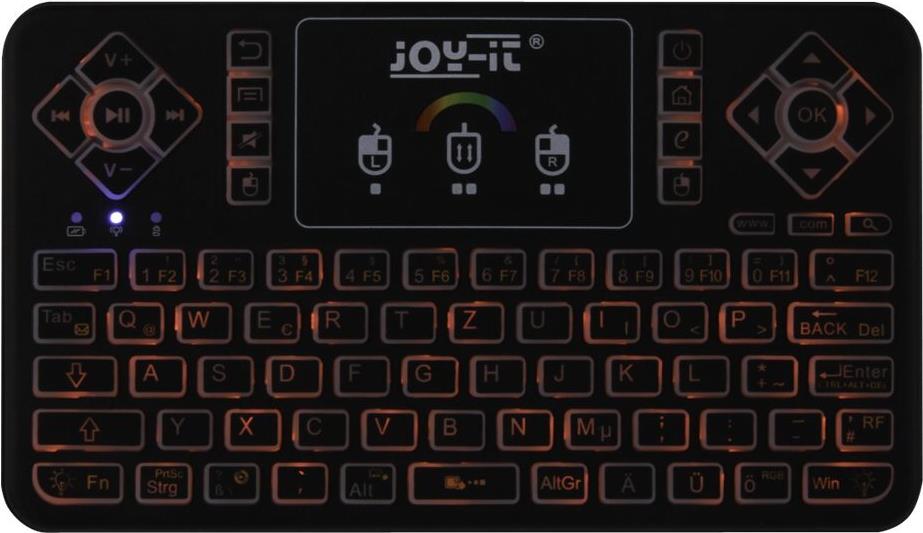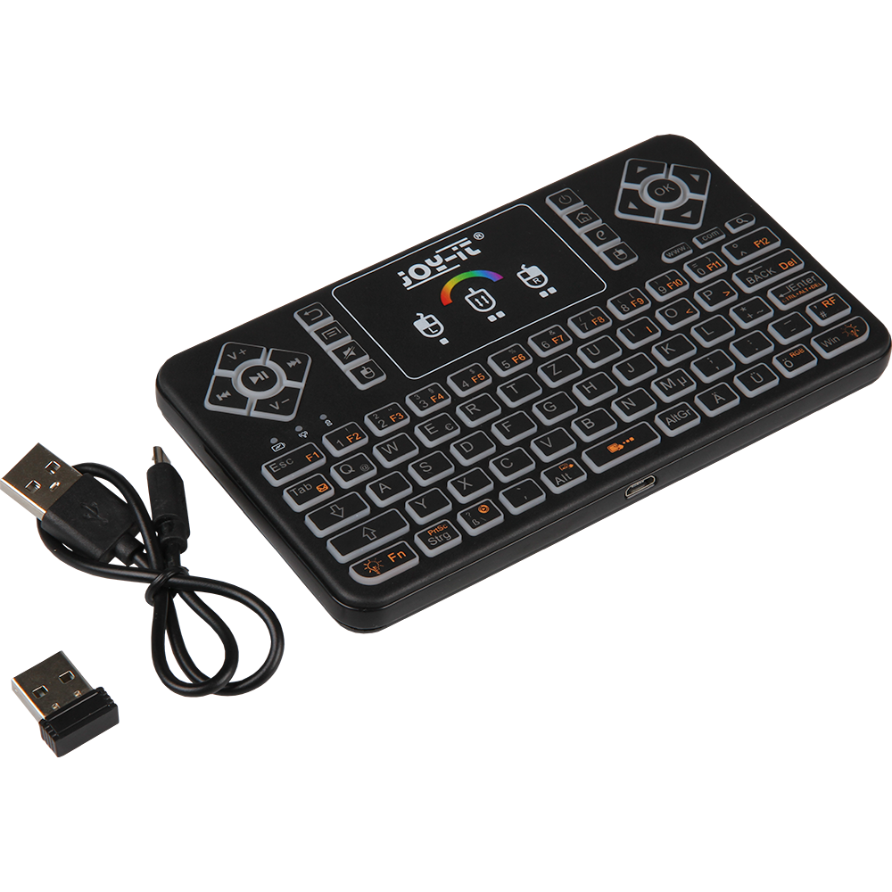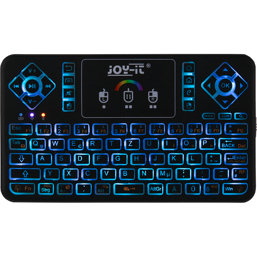 Diese schnurlose Mini-Tastatur mit deutschem Layout hat eine Funk-Reichweite von bis zu 10 Metern bei einer Sendeleistung von maximal +5 dB. Sie wird per wiederaufladbarem Akku betrieben. Der mitgelieferte Funkempfänger wird einfach am USB-Anschluss des Endgerätes angeschlossen. Die Tastatur kann mit einem Computer, Smart TV, Raspberry PI und vielen weiteren Endgeräten verwendet werden. Die besonderen Highlights sind die einstellbare RGB-Hintergrundbeleuchtung, die Media-Tasten und das integrierte Touchpad.
