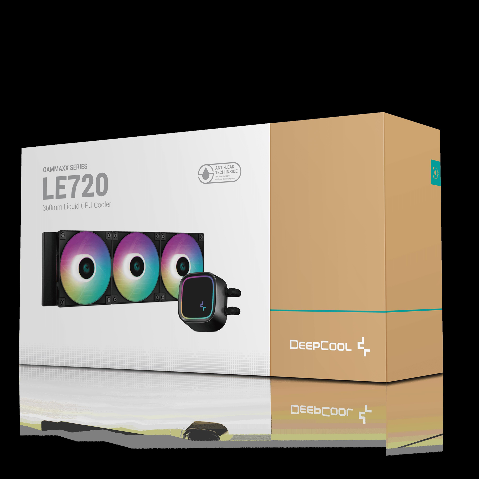 LE720Die DeepCool LE720 All-in-One-Wasserkühlung ist mit neuen Hochleistungs-ARGB-Lüftern, Wärmeleitpaste und den neuen Designelementen der DeepCool-Wasserkühlungsserie ausgestattet.LE720360mm ARGB-WasserkühlungSTARKE WÄRMEABFÜHRUNGDank eines effizienten Mikrokanal-Wasserblocks, einer dickeren Kupferkühlplatte und neuer Hochleistungs-ARGB-Lüfter erreicht die LE720 eine hervorragende Wärmeableitung von 250 Watt TDP.DAS NEUE SERIEN-DESIGNDie LE720 verfügt über eine neue Serienpumpe mit abgerundeten Ecken, einer quadratischen Form, heller ARGB-Beleuchtung und erhöhter Haltbarkeit. Die niedrige Pumpenhöhe von 52 mm bietet eine hervorragende Kompatibilität für verschiedene ITX-Gehäuse.LEISTUNGSSTARKE ARGB-LÜFTERDie mitgelieferten Hochleistungs-ARGB-Lüfter sind dynamisch, hell und unterstützen verschiedene Motherboard-Synchronisationen. Die Lüfter bieten höchste Förderleistung und statischen Druck bei höheren Drehzahlen, während sie bei niedrigeren Drehzahlen einen leisen Geräuschpegel von unter 30 dB beibehalten.ANTI-LECK-TECHNOLOGIEDie LE720 All-in-One-Wasserkühlung verfügt über die patentierte Anti-Leck-Technologie von DeepCool. Das interne Ventil reguliert den Druck und entlüftet, wenn der interne Druck den atmosphärischen Druck übersteigt. Dies führt zu einer längeren Nutzungsdauer und reduziert die Wahrscheinlichkeit von Lecks.EINFACH UND SICHEDie Installation ist einfach und kompatibel mit den neuesten Mainstream-Prozessoren von Intel und AMD.Hauptmerkmale