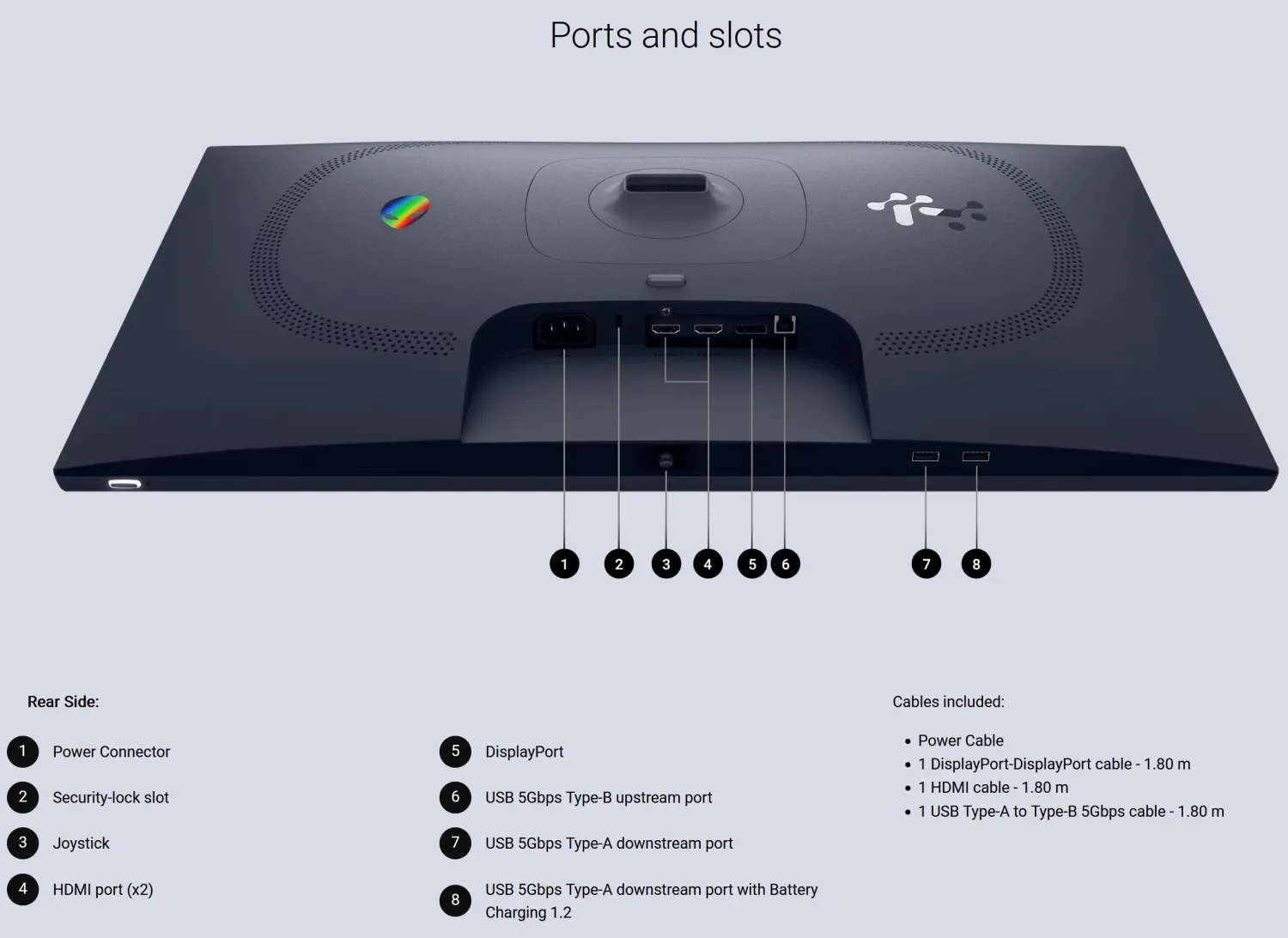 1x DisplayPort 1.4 (HDCP 2.3, 180Hz@2560x1440), 2x HDMI 2.1 (HDCP 2.3, 144Hz@2560x1440), 1x USB-B 3.0 (Upstream, 5Gb/?s), 1x USB-A 3.0 (Downstream, 5Gb/?s, BC), 1x USB-A 3.0 (Downstream, 5Gb/?s), 1x AC-In C14 (Netzanschluss) |