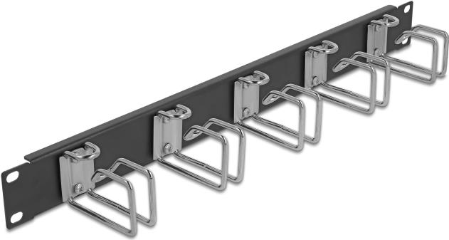Dieses Rangierpanel von Delock kann in einen 19" Geräteschrank eingebaut werden. Mit den stabilen Kabelführungsbügeln aus Metall können Patchkabel geordnet horizontal verlegt werden.