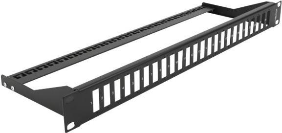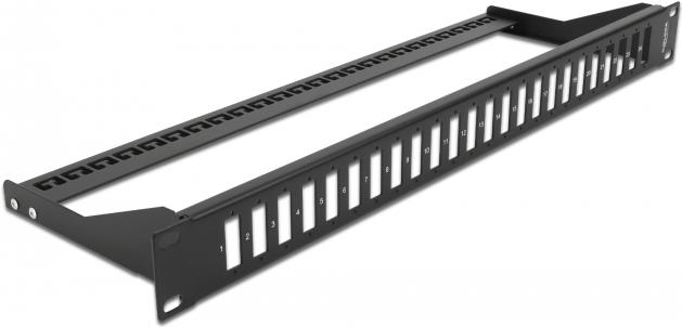 Dieses Patchpanel von Delock kann in einen 19" Geräteschrank eingebaut werden. Es bietet 24 Einbauplätze für die individuelle Montage von SC Duplex oder LC Quad Kupplungen.