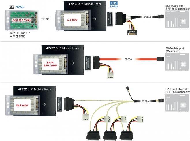 Eine 2.5" U. 2 SSD kann in den Einschub eingebaut und in den Wechselrahmen geschoben werden. Außerdem kann eine SATA oder SAS HDD oder SSD eingebaut werden. Je nachdem welcher Speichertyp eingebaut wird, muss das entsprechende Kabel an die Rückseite angeschlossen und mit dem System verbunden werden. Dies ist möglich, da der SFF-8639 Port ein Anschließen eines SAS 29 Pin oder SATA Kabels zulässt. Die Hot Swap Funktion erlaubt einen Festplattenwechsel im laufenden Betrieb.