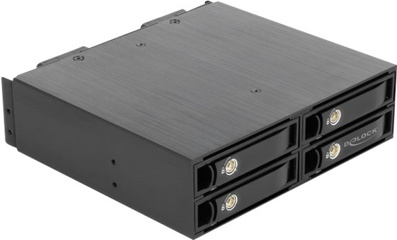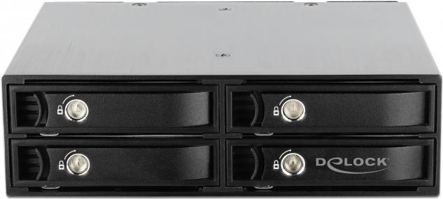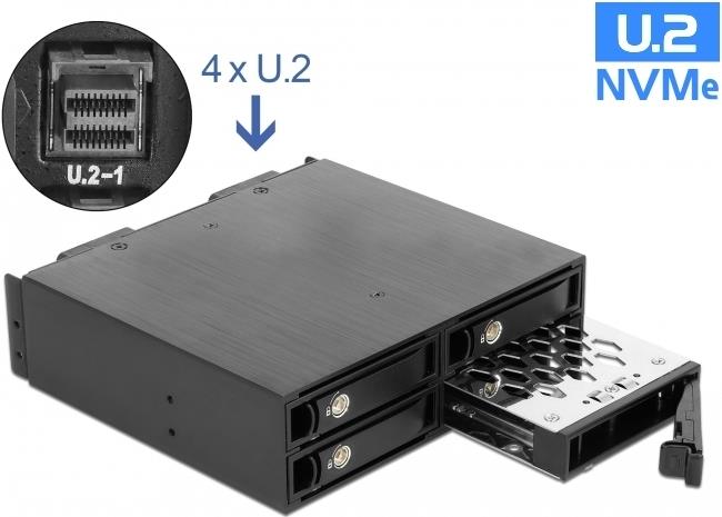 Dieser solide Metallwechselrahmen von Delock ist zum Einbau in einen freien 5.25" Schacht eines PCs, IPCs oder Server Gehäuses geeignet und ermöglicht den Betrieb von bis zu vier 2.5" U.2 SSDs. Um an jedem Anschluss die maximale Geschwindigkeit zu gewährleisten, besitzt jeder Slot einen eigenen SFF-8643 Anschluss.