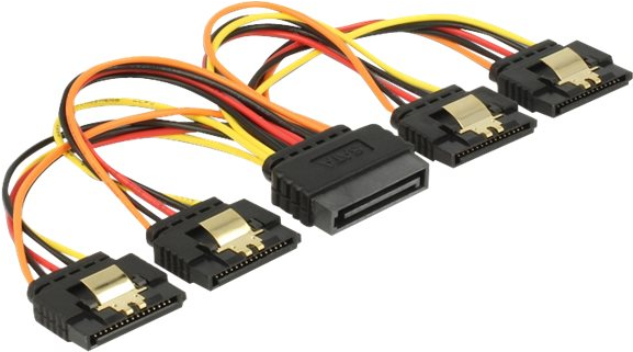 Dieses Kabel von Delock dient der Stromversorgung von vier SATA Geräten über einen freien SATA 15 Pin Stromanschluss des Netzteils. Durch die Metallclips an den Buchsen und die Metallclip-Aufnahme am Stecker wird ein zusätzliches Einrasten beim Anschließen des Kabels ermöglicht.