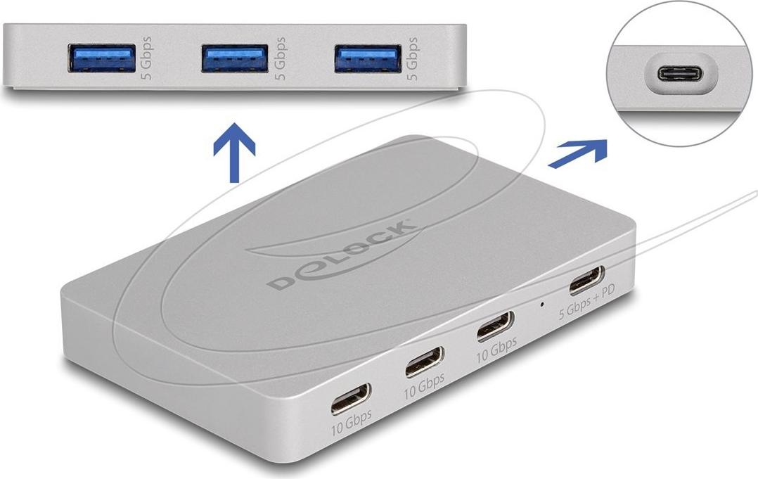 Der Delock USB-C-Hub wurde für verbesserte Konnektivität und Effizienz entwickelt. Mit einem 80 cm langen USB-C-Kabel unterstützt dieser vielseitige Hub eine Stromversorgung von bis zu 82 W und ermöglicht so schnelles Laden bei gleichzeitiger Datenübertragung. Der Hub verfügt über 7 Anschlüsse, darunter 3 USB-C 3.2 Gen 2-Anschlüsse, 3 SuperSpeed USB-Anschlüsse und 1 USB-C-Anschluss speziell für die Stromversorgung. Eine LED-Statusanzeige informiert den Benutzer über den Verbindungsstatus, sodass die Funktionalität auf einen Blick überprüft werden kann.