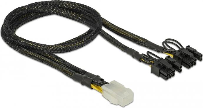 Dieses Delock Stromkabel dient zur Stromversorgung von PCI Express Karten, die eine hohe Leistungsaufnahme haben und zwei 8 Pin bzw. zwei 6 Pin Stromanschlüsse besitzen, wie z. B. Grafikkarten. An den beiden 8 Pin Steckern können zwei Pins vom Stecker getrennt werden, dadurch erhalten Sie den 6 Pin PCIe Anschluss.