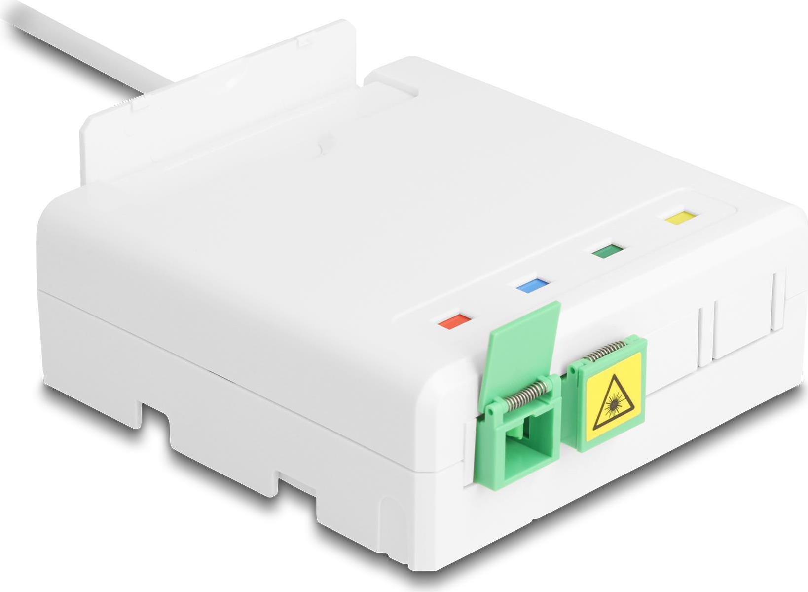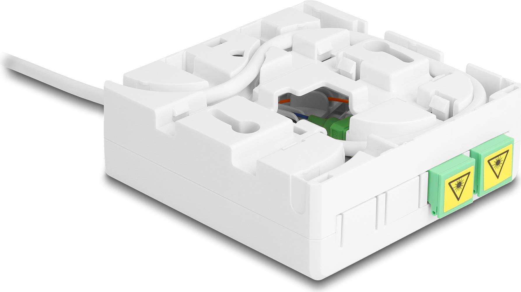 Entdecken Sie die Delock-Glasfaseranschlussdose, eine vielseitige Lösung, die den Anforderungen von Netzwerken im Innen- und Außenbereich gerecht wird. Dieses Produkt wurde mit Blick auf Langlebigkeit und Leistung entwickelt und verfügt über eine robuste Konstruktion aus Acrylnitril-Butadien-Styrol (ABS) und Low-Smoke Zero Halogen (LSZH)-Technologie für erhöhte Sicherheit. Er unterstützt die Glasfasertechnologie mit Simplex-SC/APC-kompatiblen Steckern und entspricht den G.657.A1-Standards, was effiziente und hochwertige Verbindungen für bis zu 4 Ports gewährleistet. Ob auf einer DIN-Schiene oder an der Wand montiert, seine flexiblen Platzierungsmöglichkeiten machen ihn zu einer idealen Wahl für Fiber-To-The-Home (FTTH)-Anwendungen. Mit der Fähigkeit, extremen Temperaturen von -40 °C bis 85 °C standzuhalten, ist diese Anschlussdose so gebaut, dass sie unter allen Bedingungen funktioniert. Im Lieferumfang ist ein Montagesatz enthalten, der die Installation vereinfacht.Produkttext[/head]Dieses vorkonfektionierte FTTH Anschlussset von Delock eignet sich ideal für den schnellen und sicheren Aufbau des Glasfasernetzes in Gebäuden.Anschlussdose zur Wand- und HutschienenmontageDie Anschlussdose hat Montageöffnungen zur Befestigung in Unterputz- und Hohlwanddosen. Durch die integrierten Clips ist die Montage auf eine 35 mm Hutschiene sowohl horizontal als auch vertikal möglich.Mit FTTH VerlegekabelDas Verlegekabel befindet sich auf einer Spule in einer Kartonbox und die Kabel sind bereits in der Dose anschlussfertig montiert. Beim geschlossenen Karton lassen sich somit die Kabel leicht herausziehen und bis zum Hausverteiler verlegen.[head]Hauptmerkmale