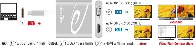 Dieser Splitter von Delock ist für den Anschluss eines VGA Monitors und eines HDMI Monitors an einen Computer mit USB-C Schnittstelle und DisplayPort Alternate Mode Unterstützung geeignet. Zwei Monitore können gleichzeitig an den Ausgängen betrieben werden.