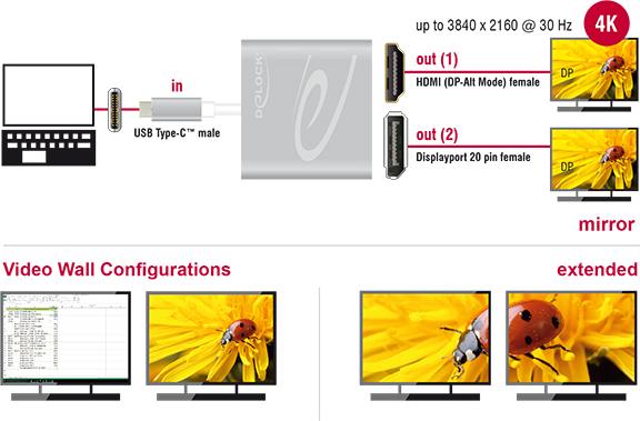 Dieser Splitter von Delock ist für den Anschluss eines Displayport Monitors und eines HDMI Monitors an einen Computer mit USB-C Schnittstelle und Displayport Alternate Mode Unterstützung geeignet. Zwei Monitore können gleichzeitig an den Ausgängen betrieben werden. Der Displayport Ausgang ist Dual Mode fähig (DP++), so können HDMI oder DVI Monitore mit einem entsprechenden Adapter angeschlossen werden.