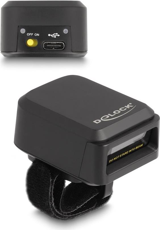 Dieser Ringbarcode Scanner von Delock kann mit einem PC, Notebook oder direkt mit dem Handy oder Tablet kabellos verbunden werden. Es können alle gängigen 1D und 2D Barcodetypen auch auf weite Entfernung präzise erfasst werden. Zusätzlich erkennt der Scanner auf Displays und Monitoren dargestellte Barcodes.Automatische Anpassung an UmgebungshelligkeitDer Scanner passt sich automatisch an die Umgebungshelligkeit an und erfasst unter optimalen Lichtverhältnissen bis zu 100 Scans in der Sekunde.Bei geringer Umgebungshelligkeit wird der Barcode durch eine zusätzliche weiße LED beleuchtet und ist somit auch bei schlechten Lichtverhältnissen einsetzbar.Klein und PraktischDieser kleine Ringscanner kann praktisch mit dem Klettverschluss am Finger befestigt werden, so dass der Träger die Hände frei hat, um zum Beispiel einen Karton zu halten. Dank der Rotationsvorrichtung lässt sich der Scanner drehen und ist somit für Rechts- wie auch Linkshänder geeignet.Übertragung via Bluetooth, USB oder 2,4 GHzDie Datenübertragung der gescannten Barcodes erfolgt entweder über Bluetooth direkt mit dem bluetooth fähigem Ausgabegerät oder über das 2,4 GHz Frequenzband mit Hilfe des beiliegenden USB Dongles. Alternativ kann der Scanner mit dem beiliegendem USB Kabel am Rechner verbunden werden.Kabelloses LadenDer Ringscanner kann entweder über die USB Type-C™ Buchse oder mittels der induktiven Ladefunktion im Scanner selbst geladen werden. Zum Beispiel mit der Delock Ladestation 90608.Hauptmerkmale