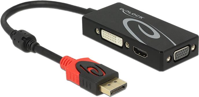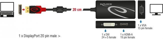 Mit diesem Displayport Adapter von Delock kann das System um eine VGA, HDMI oder DVI Schnittstelle erweitert und verschiedene Geräte, wie z.B. Fernseher, Projektor, Monitor etc. angeschlossen werden. Es kann nur ein Monitor am Adapter betrieben werden.