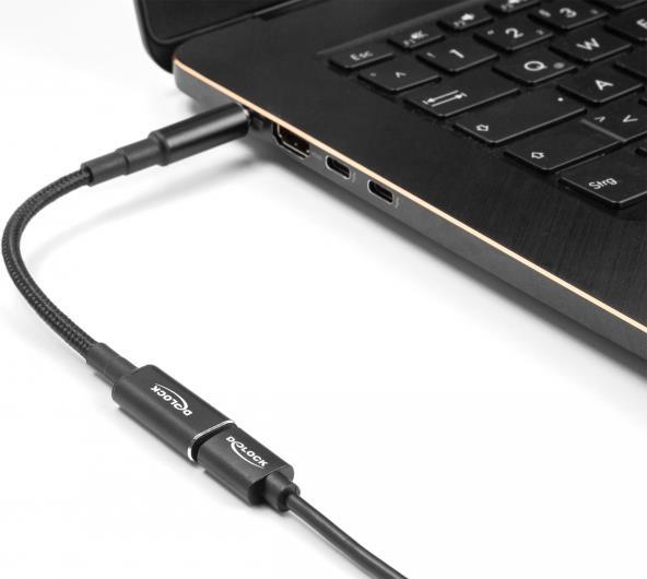 Mit diesem Adapterkabel von Delock kann ein USB Typ-C Kabel zum Laden eines Laptops verwendet werden. Der 90°-Winkel verhindert das Abknicken des Kabels und durch die geringen Abmessungen ist der Adapter ein idealer Begleiter für unterwegs.