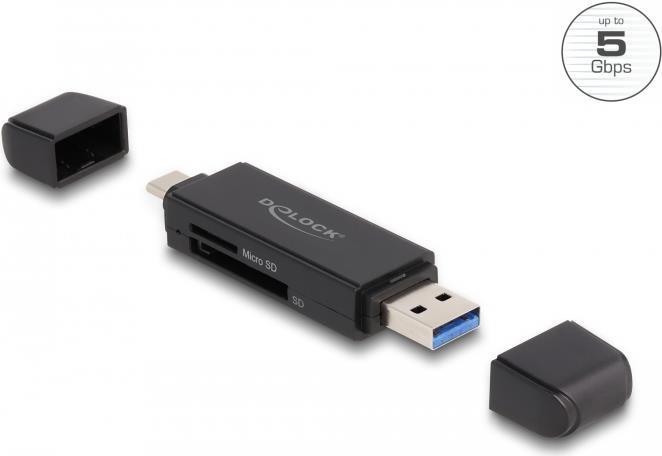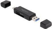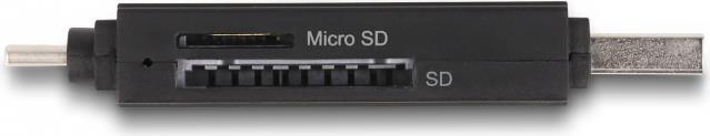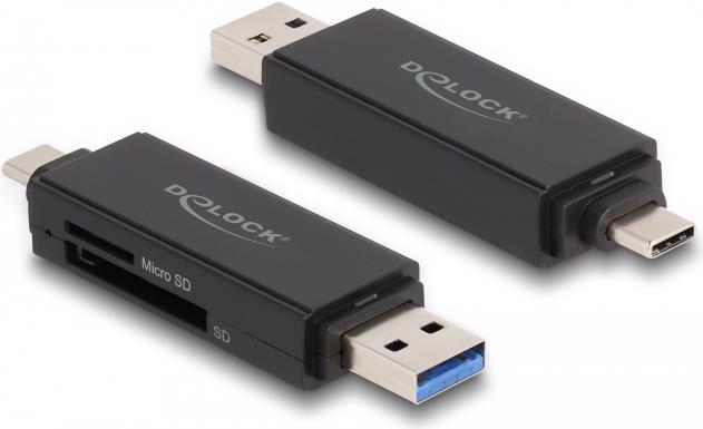 Dieser Card Reader von Delock verfügt über zwei Speicherkartenslots und ermöglicht das Lesen und Beschreiben von verschiedenen SD, MMC und Micro SD Speicherkarten. Über die USB Type-C oder die USB Typ-A Schnittstelle wird der Card Reader an einen PC oder an ein mobiles Gerät angeschlossen.