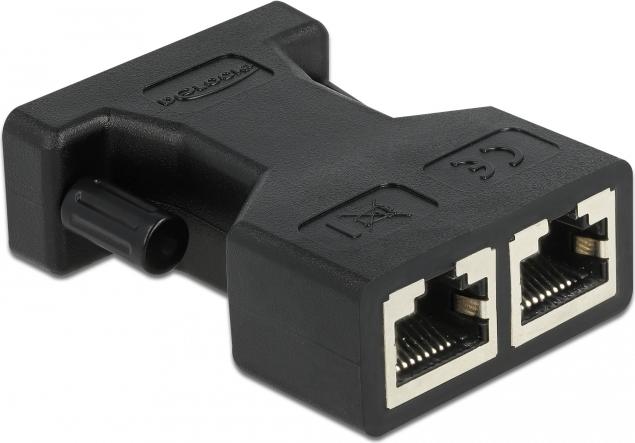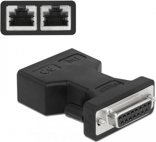 Dieser Adapter von Delock verfügt über eine D-Sub 15 Buchse, die sich für Gameports am PC eignet. An den zwei RJ45 Buchsen können über zwei Cat5 Netzwerkkabel verschiedene Geräte angeschlossen werden.