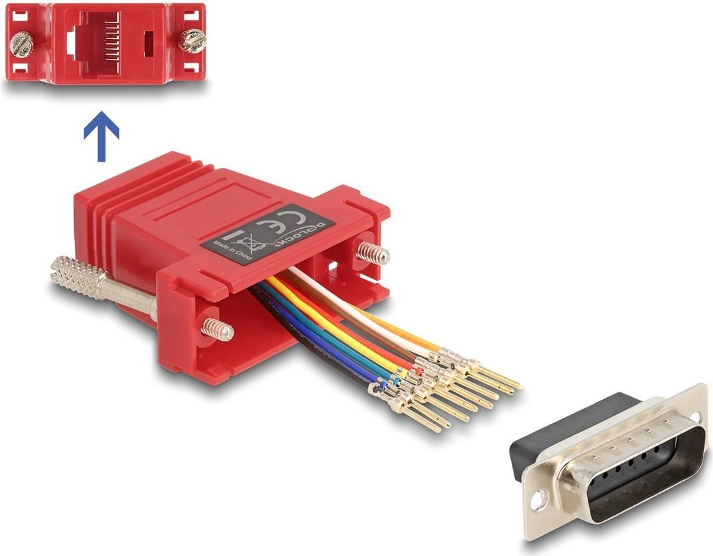 Der serielle Adapter von Delock bietet mit seiner kundenspezifischen Montage zuverlässige Konnektivität. Der auf Vielseitigkeit ausgelegte Adapter verfügt auf der einen Seite über einen 15-poligen D-Sub-Stecker (DB-15) und auf der anderen Seite über eine RJ-45-Buchse, wodurch er für verschiedene Anwendungen geeignet ist. Mit einer Rändelschraube am linken Stecker kann der Benutzer eine sichere Verbindung herstellen, die sicherstellt, dass das Kabel während des Gebrauchs an seinem Platz bleibt. Dieser Adapter ist ideal für alle, die eine nahtlose Verbindung zwischen seriellen Geräten und Netzwerkanschlüssen herstellen möchten.