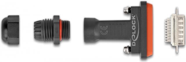 Dieser D-Sub Stecker von Delock eignet sich für die Lötmontage und wird zur Kabelkonfektion verwendet. Das wasserdichte Gehäuse mit der Schutzklasse IP67 schützt die Kabeldrähte vor Feuchtigkeit und eignet sich ideal für den Einsatz im Schaltschrank.