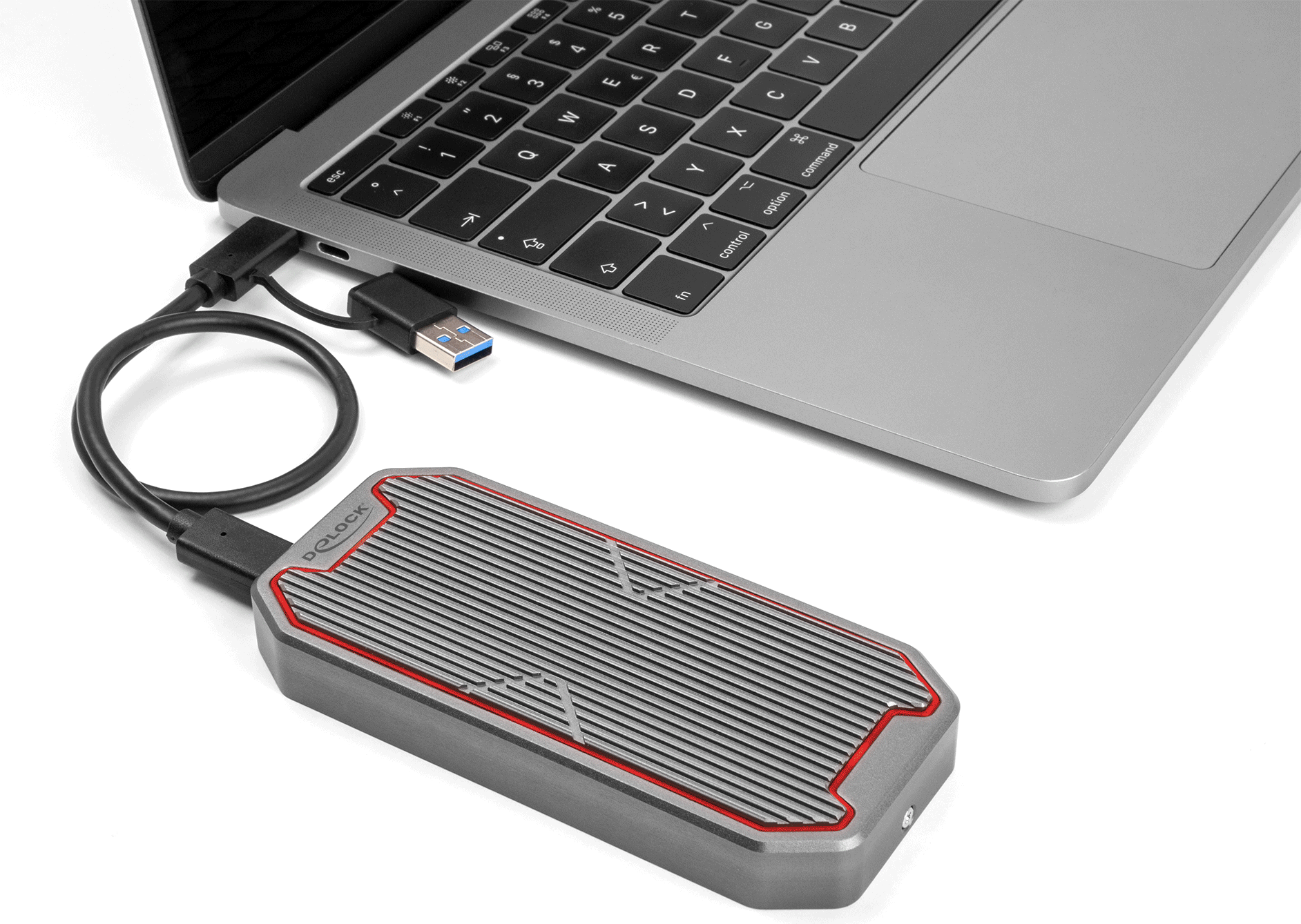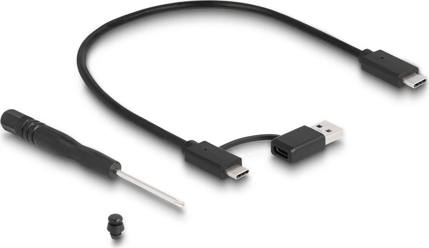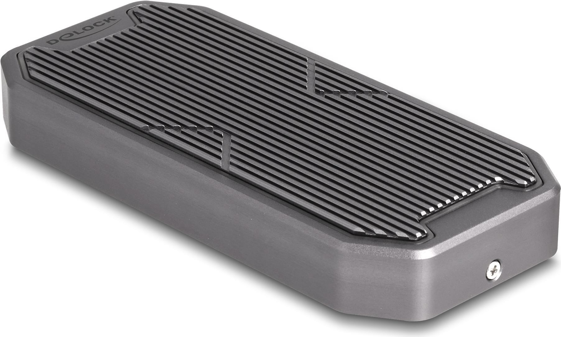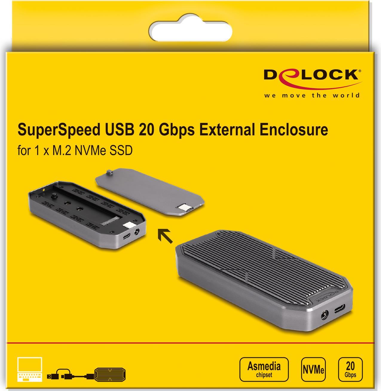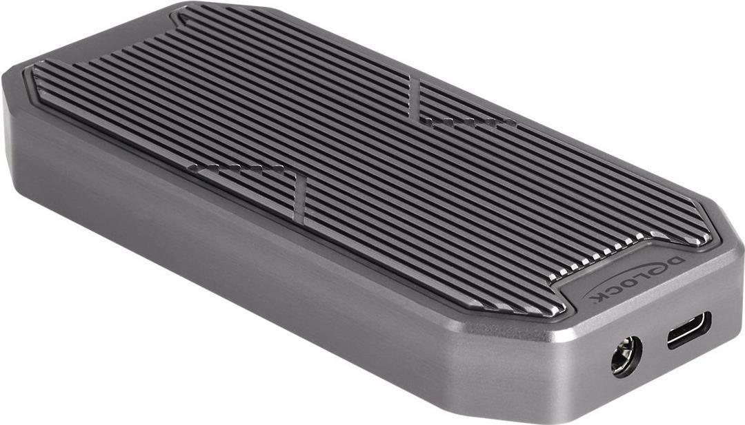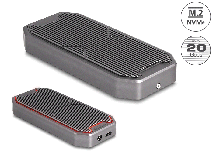 Dieses Gehäuse von Delock ermöglicht den Einbau einer M.2 PCIe NVMe SSD im 2280-, 2260- und 2242-Format, es kann über USB an den PC oder Laptop angeschlossen werden. Das robuste Metallgehäuse mit Kühlrippen sorgt für eine optimale Temperatur des Speichers.Produkttext[/head]Dieses Gehäuse von Delock ermöglicht den Einbau einer M.2 PCIe NVMe SSD im 2280, 2260 und 2242 Format, und kann via USB an einen PC oder ein Notebook angeschlossen werden. Das robuste Metallgehäuse mit Kühlrippen sorgt für eine optimale Temperatur des Speichers.SuperSpeed USB 20 GbpsDas Gehäuse ermöglicht eine Datentransferrate von 20 Gbps am USB-C™ Anschluss.Gaming StyleDas elegante Design des Delock Gehäuses passt perfekt zu einem Gaming PC und darüber hinaus sorgt die im Farbverlauf leuchtende RGB LED Beleuchtung auf der Oberseite für einen echten Hingucker.Zusätzlicher StromanschlussAn die DC Strombuchse kann zusätzlich ein Netzteil angeschlossen werden, wenn eine M.2 SSD mit besonders viel Strombedarf eingebaut wird und die Stromversorgung über die USB Buchse nicht ausreichend ist.[head]Hauptmerkmale