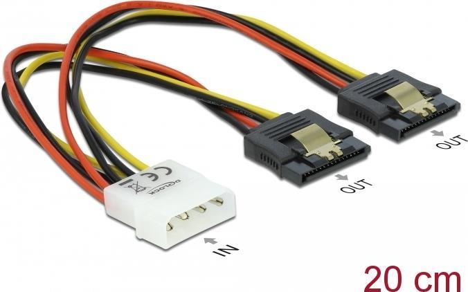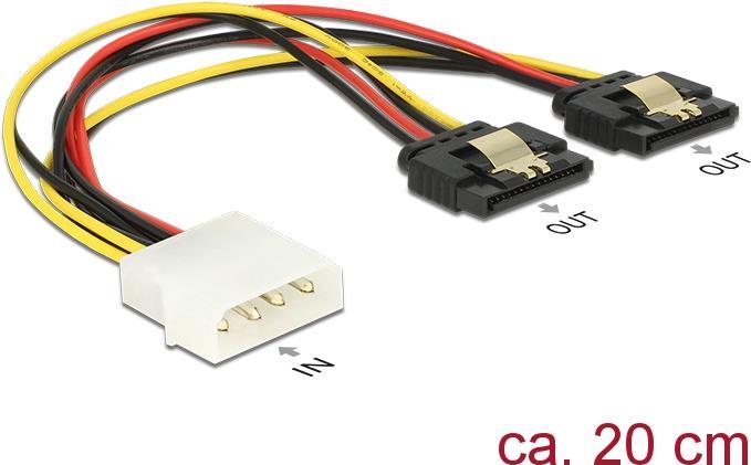 Dieses Kabel von Delock dient der Stromversorgung von zwei Geräten mit SATA 15 Pin Stromanschluss über einen freien Molex 4 Pin Stromanschluss des Netzteils. Die Metallclips an den SATA Buchsen sorgen dafür, dass die Kabel zuverlässig einrasten.