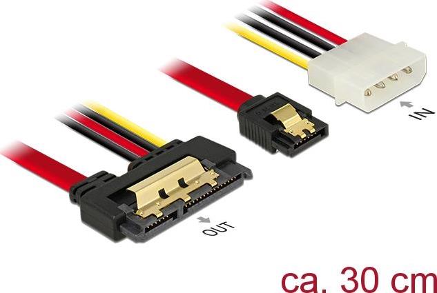 Dieses Kabel von Delock dient dem Anschluss eines Gerätes mit 22 Pin SATA Schnittstelle über einen freien SATA 7 Pin Port sowie einen freien 4 Pin Molex Stromanschluss des Netzteils. Die Metallclips an den SATA Buchsen sorgen dafür, dass die Kabel zuverlässig einrasten.