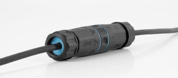Der Kabelverbinder besteht aus insgesamt 5 Kunststoff Teilen (1 x RJ45 Kupplung, 2 x Gehäuse und 2 x Schraubkappe) und 4 Ringen. Der Dichtungsring am Durchführungsloch des Gehäuses dichtet zwischen Kabel und Gehäuse ab. Er kann an der Seite geöffnet werden, damit das Kabel eingelegt werden kann. Die beiden Schraubgewinde direkt an der RJ45 Kupplung sind jeweils mit einem Silikon-Dichtring geschützt.