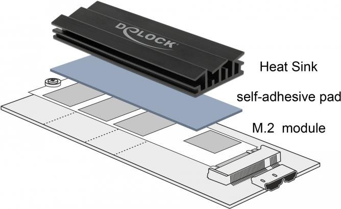 Dieser Kühlkörper von Delock dient der Wärmeableitung des M.2 Moduls und kann mit Hilfe der beiliegenden selbstklebenden Wärmepads auf einem M.2 Modul befestigt werden.