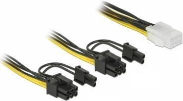 Dieses Delock Stromkabel dient zur Stromversorgung von PCI Express Karten, die eine hohe Leistungsaufnahme haben und zwei 8 Pin bzw. zwei 6 Pin Stromanschlüsse besitzen, wie z. B. Grafikkarten. An den beiden 8 Pin Steckern können zwei Pins vom Stecker getrennt werden, dadurch erhalten Sie den 6 Pin PCIe Anschluss.