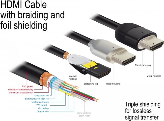 Das Kabel zeichnet sich durch die zusätzliche Metallummantelung der Stecker und die vergoldeten Kontakte aus. Zudem garantiert es durch seine dreifache Schirmung sowie das besonders dichte Mantelgeflecht eine störungsfreie Audio- und Videosignalübertragung.