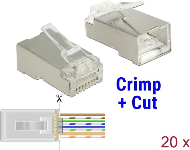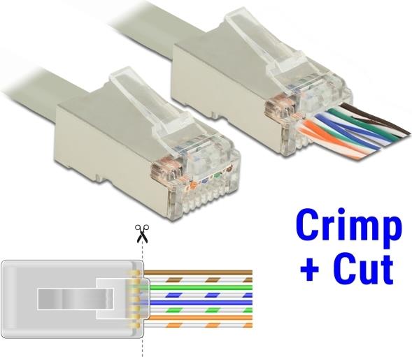 Mit diesem RJ45 Stecker von Delock und dem passenden Crimp+Cut Werkzeug kann schnell und einfach ein Netzwerkkabel mit einem RJ45 Stecker verbunden werden.