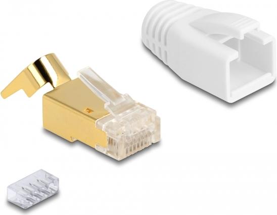 Dieses hochwertige RJ45-Steckerset von Delock enthält geschirmte RJ45-Stecker mit Zugentlastung, Knickschutztüllen und einen Kabelmanager für die optimale Montage von Kabeln von 23 - 22 AWG.