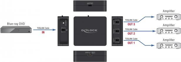 Mit diesem TOSLINK Switch von Delock können bis zu drei TOSLINK Geräte z. B. an einer Heimkino Anlage betrieben werden.