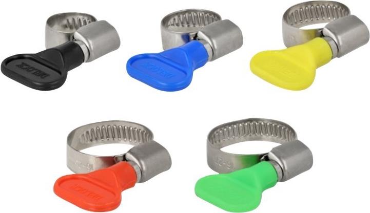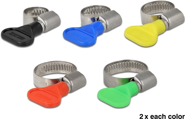2 schwarze Schlauchschellen (8 - 12 mm), 2 blaue Schlauchschellen (10 - 16 mm), 2 gelbe Schlauchschellen (13 - 19 mm), 2 rote Schlauchschellen (16 - 25 mm), 2 grüne Schlauchschellen (16 - 27 mm) |