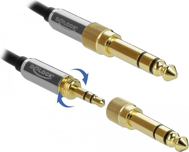 Dieses Klinkenkabel von Delock kann zum Anschluss diverser Audiogeräte mit 3,5 mm bzw. 6,35 mm Klinkenbuchse eingesetzt werden. Die beiliegenden Klinkenadapter lassen sich auf den 3,5 mm Stecker schrauben und sorgen so für eine stabile Verbindung. Somit ist das Kabel auch zum Anschluss von Audio Geräten mit einer 6,35 mm Schnittstelle geeignet.