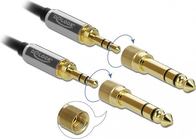 Dieses Klinkenkabel von Delock kann zum Anschluss diverser Audiogeräte mit 3,5 mm bzw. 6,35 mm Klinkenbuchse eingesetzt werden. Die beiliegenden Klinkenadapter lassen sich auf den 3,5 mm Stecker schrauben und sorgen so für eine stabile Verbindung. Somit ist das Kabel auch zum Anschluss von Audio Geräten mit einer 6,35 mm Schnittstelle geeignet.
