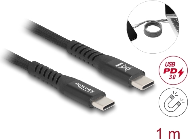 Delock - USB-Kabel - 24 pin USB-C (M) zu 24 pin USB-C (M) - USB 2,0 3 A - 1,0m - geflochtenes Kabel, magnetisch, unterstützt Power Delivery 3,0, USB Power Delivery (60W) - Schwarz (81119)