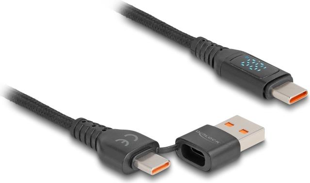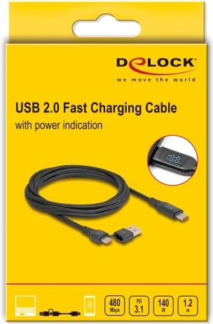 DeLOCK USB 2.0 Schnellladekabel USB Type-C™ + USB Typ-A Stecker zu USB Type-C™ Stecker PD 3.1 140 W mit Leistungsanzeige 1,20 m (88137)