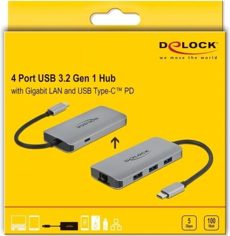 | Produktbeschreibung | DeLOCK USB 3.2 Gen 1 Hub with 4 Ports and Gigabit LAN and PD - Hub - 4 Anschlüsse |