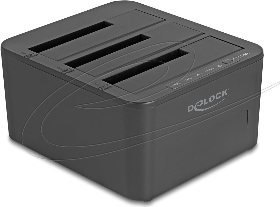 Die Delock HDD/SSD-Dockingstation bietet eine vielseitige Lösung für die externe Datenverwaltung, da sie sowohl 2,5-Zoll- als auch 3,5-Zoll-Laufwerke aufnehmen kann. Das abnehmbare USB-A-zu-USB-B-Stromkabel ermöglicht einen einfachen Anschluss, während die Länge von 1 m Flexibilität bei der Platzierung bietet. Die Dockingstation vereinfacht die Datenübertragung mit einer 1:2-Klonfunktion, mit der Benutzer Daten zwischen zwei Laufwerken duplizieren können. LED-Statusanzeigen informieren den Benutzer über den Betriebsstatus, und ein Ein-/Aus-Schalter für die Laufwerke verbessert die Kontrolle über die angeschlossenen Geräte.
