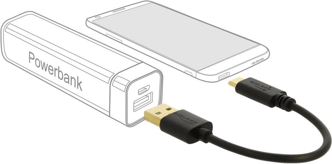 Dieses extra kurze USB Ladekabel von Delock eignet sich besonders unterwegs zum Aufladen von Smartphones an einer Powerbank.