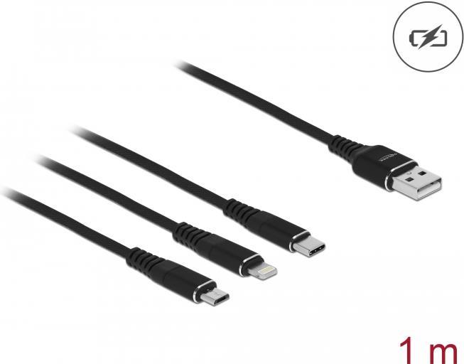 Dieses 3 in 1 Ladekabel von Delock dient zum Aufladen diverser Geräte, wie z. B. Tablets oder Smartphones mit Lightning, Micro USB-B oder USB Type-C Anschluss über eine USB Stromquelle.