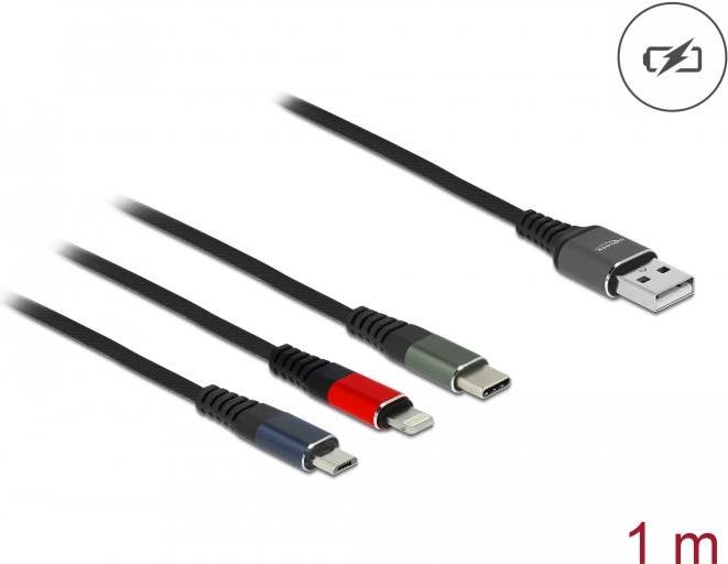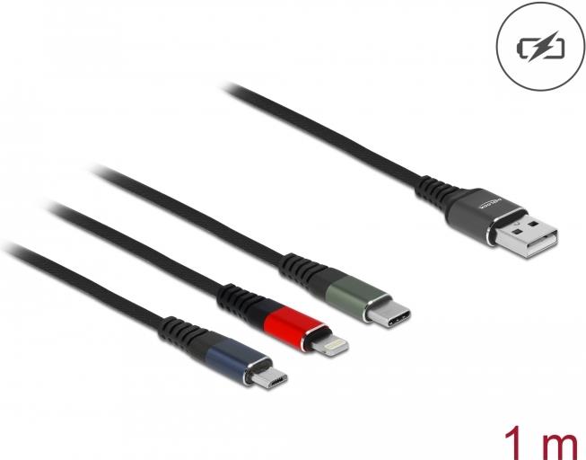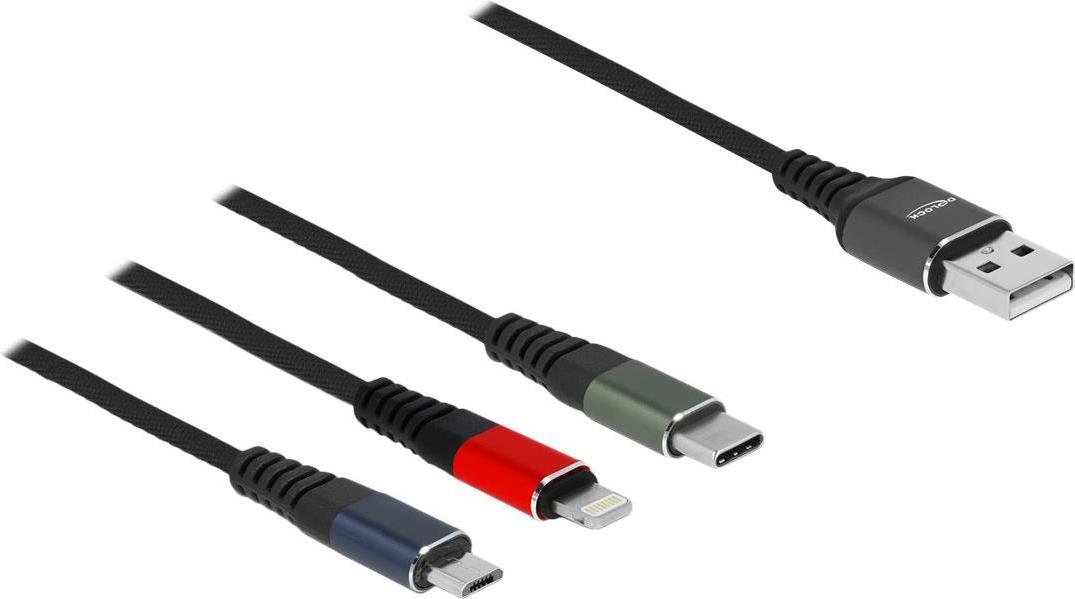 Dieses 3 in 1 Ladekabel von Delock dient zum Aufladen diverser Geräte, wie z. B. Tablets oder Smartphones mit Lightning, Micro USB-B oder USB Type-C Anschluss über eine USB Stromquelle.