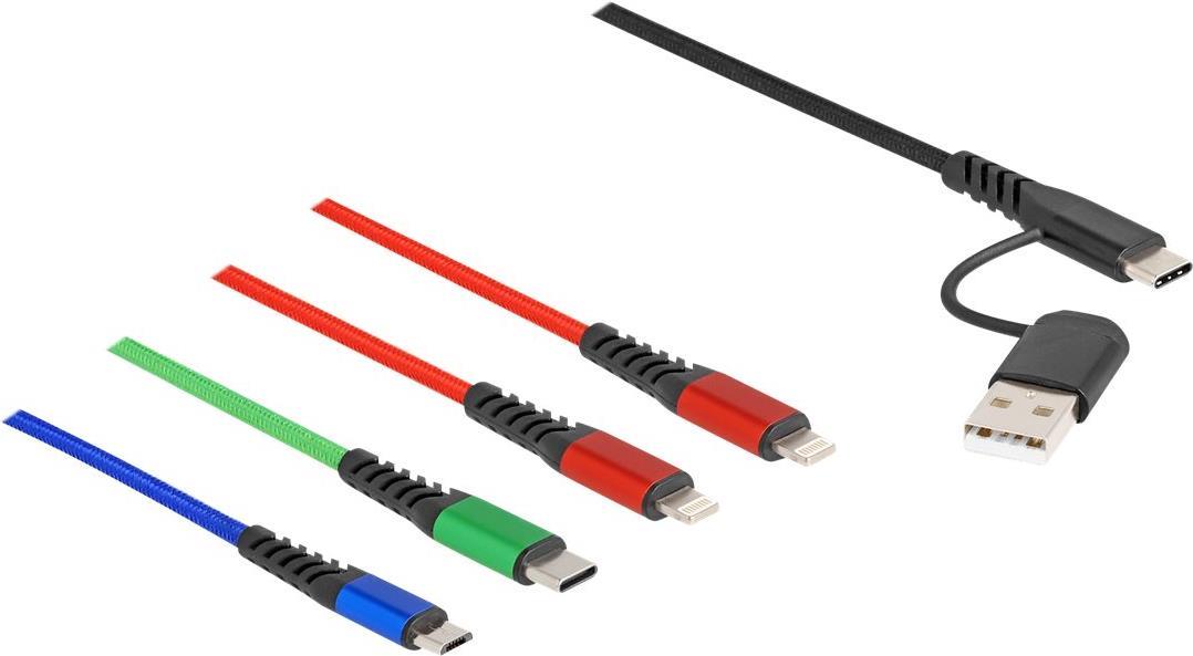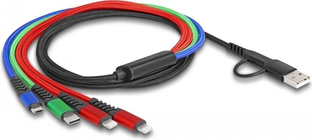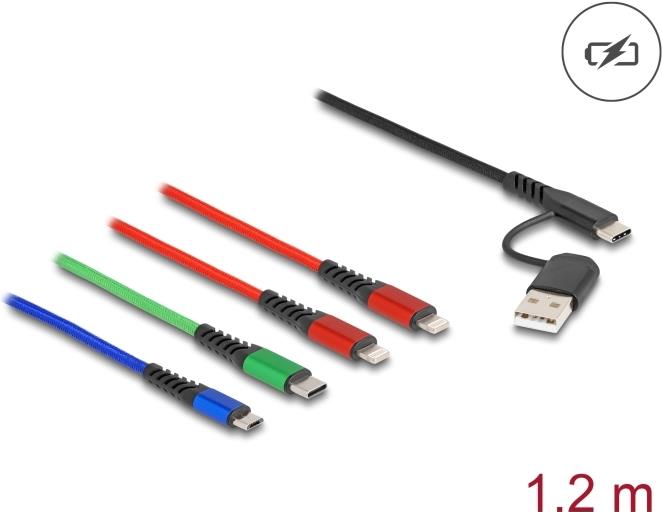 Dieses 4-in-1-Ladekabel von Delock kann zum Aufladen verschiedener Geräte wie z.B. Tablets oder Smartphones mit Lightning-, Micro USB-B- oder USB-Typ-C-Schnittstelle über eine USB-Stromquelle verwendet werden. Die Besonderheit hierbei ist der USB-A-Anschluss, der mit einem USB-C-Stecker kombiniert ist. Somit kann eine Stromquelle mit einem USB-A- oder USB-C-Anschluss verwendet werden.