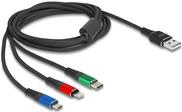 Dieses Stromkabel von Delock ist auf Vielseitigkeit und Langlebigkeit ausgelegt, was es zu einem unverzichtbaren Zubehör für verschiedene Geräte macht. Es verfügt über mehrere rechte Steckertypen, darunter einen 24-poligen USB-C, Apple Lightning und einen 4-poligen Micro-USB Typ-B, was die Kompatibilität mit einer Vielzahl von Geräten ermöglicht. Der linke Anschluss ist ein 4-poliger USB Typ-A, der eine nahtlose Stromversorgung gewährleistet, wo immer sie benötigt wird. Das Kabel ist mit einer geflochtenen Ummantelung und einer Zugentlastung ausgestattet, um die Langlebigkeit zu erhöhen und die Abnutzung zu minimieren. Die Verwendung von verzinnten Kupferleitern sorgt für eine effiziente Stromübertragung, während das Metallgehäuse für eine zusätzliche Schicht Haltbarkeit sorgt. Mit einer Nennspannung von 5 V und einer Stromstärke von 3 A ist dieses Kabel für die unterbrechungsfreie Stromversorgung von Geräten geeignet.