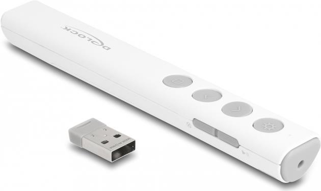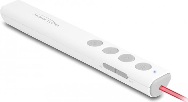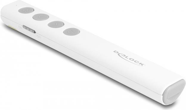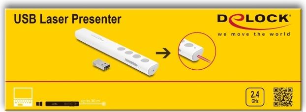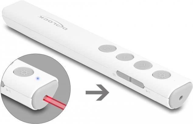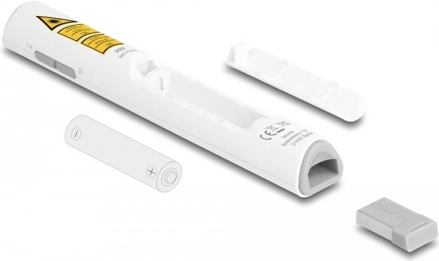 Entdecken Sie die Delock-Präsentationsfernbedienung, ein Werkzeug zur Verbesserung Ihrer Präsentationen. Mit ihrer kabellosen 2,4-GHz-Technologie bietet diese Fernbedienung eine zuverlässige Verbindung, damit Ihre Präsentationen reibungslos und ohne Unterbrechungen ablaufen. Der integrierte Laserpointer mit rotem Laser ermöglicht es Ihnen, wichtige Informationen präzise hervorzuheben, damit Ihre Aussagen noch besser zur Geltung kommen. Die Kompatibilität mit Notebooks und PCs macht sie zu einer vielseitigen Wahl für verschiedene Präsentationsumgebungen. Dank der Plug-and-Play-Funktionalität der Fernbedienung können Sie Ihre Präsentation in Sekundenschnelle starten, ohne sich mit komplizierten Einrichtungsprozeduren herumschlagen zu müssen. Darüber hinaus sorgt der magnetische Steckplatz für den USB-Empfänger dafür, dass Sie sich keine Sorgen machen müssen, ihn zu verlieren - das ist bequem und beruhigend. Mit einer Reichweite von bis zu 30 m haben Sie die Freiheit, mit Ihrem Publikum in Kontakt zu treten und sich im Raum zu bewegen, um eine dynamische und interaktive Präsentation zu gestalten. Die Fernbedienung besteht aus robustem Kunststoff und entspricht den Standards der Laserklasse 2. Sie ist sicher und langlebig und damit ein unverzichtbares Hilfsmittel für Pädagogen, Fachleute und alle, die mit ihren Präsentationen eine starke Wirkung erzielen möchten.