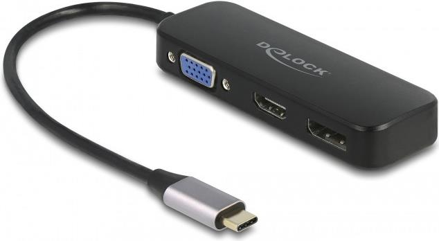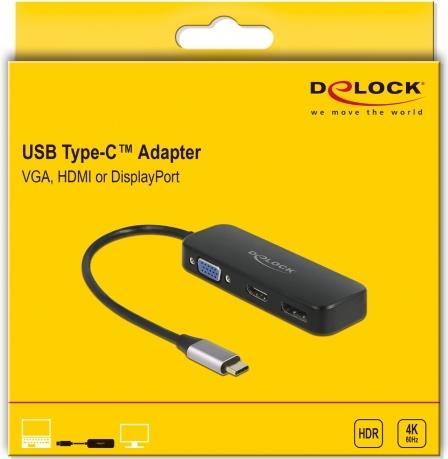 Dieser Adapter von Delock ist für den Anschluss eines VGA, HDMI oder DisplayPort Monitors, Beamers oder TVs an einen Computer, Notebook, Tablet oder Smartphone mit USB-C Schnittstelle und DisplayPort Alternate Mode Unterstützung geeignet. Außerdem kann der Adapter an einer Thunderbolt 3 Schnittstelle betrieben werden.