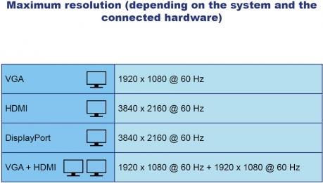 | Details zur max. Auflösung | 1920 x 1080 - 60 Hz (HDMI und VGA gleichzeitig) 1920 x 1080 - 60 Hz (nur VGA) 3840 x 2160 - 60 Hz (nur HDMI) 3840 x 2160 - 60 Hz (nur DisplayPort) |
