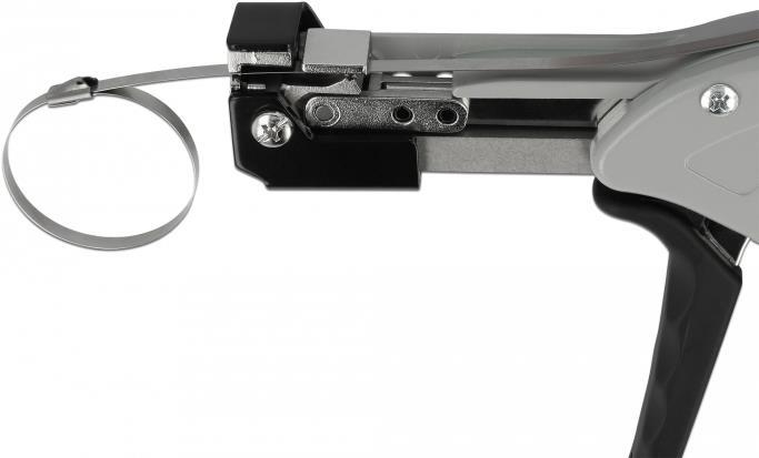 Diese Zange von Delock ermöglicht es Edelstahlkabelbinder mit einer Breite von 4,6 bis 7,9 mm in einem Schritt zu Spannen und zu Schneiden.