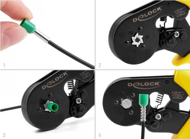 Diese hochwertige und handliche Crimpzange von Delock ist geeignet, um Aderendhülsen mit einer Größe von 0,25 bis 6 mm² zu crimpen.