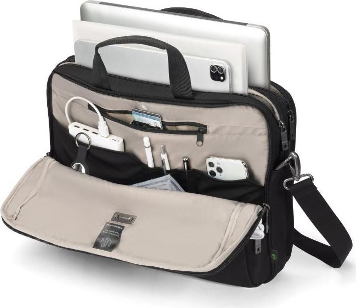 Der DICOTA Top Traveller wurde für alle entwickelt, die eine zuverlässige und funktionale Notebooktasche benötigen. Das Produkt aus strapazierfähigem 900D-Polyester ist besonders nachhaltig, da es aus recycelten Plastikflaschen hergestellt wird. Mit einer Vielzahl von Trageoptionen, darunter ein verstellbarer, gepolsterter Schultergurt, ein Tragegriff an der Oberseite und eine Trolley-Schlaufe, gewährleistet es allen Benutzern einen komfortablen Transport. Die hochdichte Schaumstoffpolsterung und die EVA-Eckpolsterung bieten zusätzlichen Schutz für Geräte, während die verschiedenen Fächer, darunter ein abschließbares Notebookfach für einen 16-Zoll-Laptop, für Ordnung und Sicherheit sorgen.