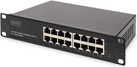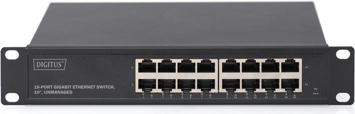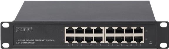 Der DIGITUS® 16-Port Gigabit Ethernet Switch stellt 16 x 10/100/1000 Mbps RJ-45 Ports mit Auto-Negotiation zur Verfügung. Alle Ports unterstützen die Auto MDI/MDIX - Funktion, was die Notwendigkeit von Crossover-Kabeln und Uplink-Ports entfallen lässt. Niedrige Kosten, einfache Handhabung und hohe Leistung sind die Stärken des DIGITUS® Gigabit Ethernet 16-Port Switches und machen ihn so zu einer exzellenten Wahl für Ihr Netzwerk. Die hohe Backplane-Bandbreite verfügt über genügend Reserven, sodass auch große Datenmengen mühelos übertragen werden können. Des Weiteren ist dieser Switch für den Einbau in 10" (254 mm) Gehäusen konzipiert und fügt mit 1HE nahtlos in Ihr Netzwerkgehäuse ein.